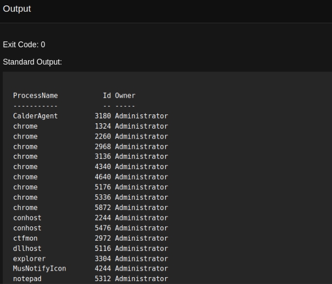 We can click “View Output” to see the outputs of any attack made. Here I looked at the output of the attack, which lists the processes on the endpoint.