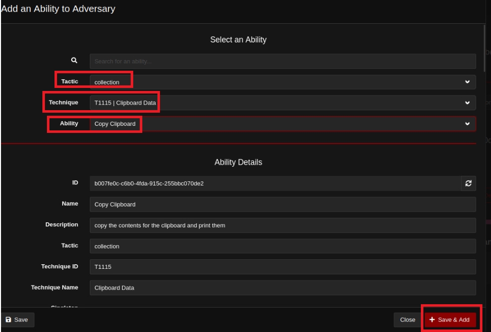 If we want to apply a specific attack type; Let’s go Campaigns > Adversaries > New Profile and Create Profile. Click Add Ability