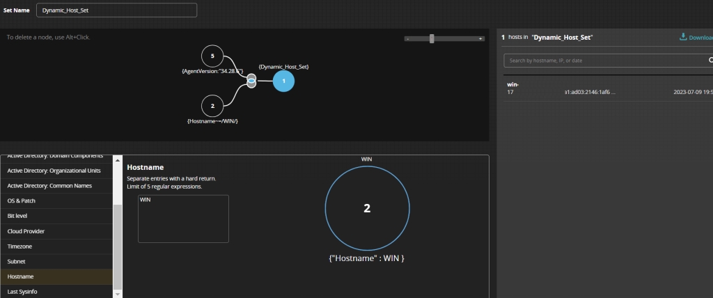 As it can be understood from the cluster sign in the middle, the common point of these two conditions is taken, that is, the endpoints with 34.28.6 version and “WIN” in their Hostname.